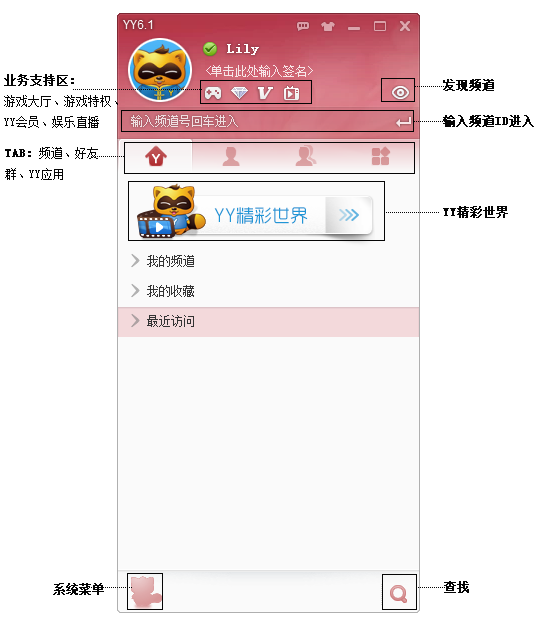 YY主面板由版本号、YY头像、在线状态菜单、昵称、个人签名、反馈问题、皮肤、最小化、最大化、关闭、频道输入区、YY业务快捷栏、发现频道、系统菜单、所在频道显示、TAB栏组成、其中TAB栏由频道、Y友、群和YY应用组成。