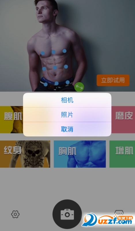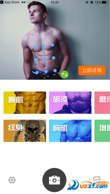 1、下载后打开软件,在首页选择你想要的效果,有腹肌、胡须、磨皮、纹身、胸肌和增肌这6个功能