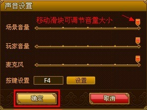 按下您需要设置的发声按键后,就可以看到发声按键已更改了。在“声音设置”界面上还可以进行设置玩家音量和麦克风音量的大小,点击“确定”按钮,设置完成。