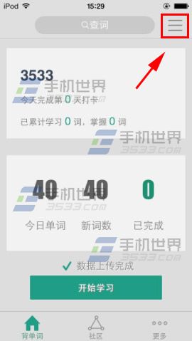 1)安装并打开扇贝单词,点击主界面右上角的【三横】,选择【单词本】。(如下图)