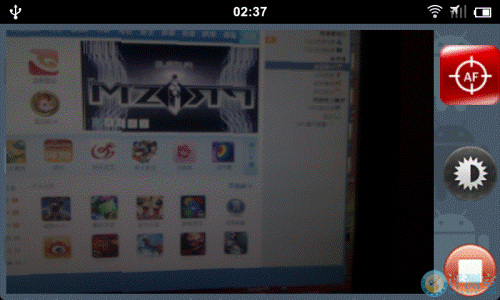 最后点击Connect,手机现在的画面已经变成摄像头显示画面了。不过这个时候大家会大仙手机端的画面可能是左右相反的,没关系,先不用理会。这个界面有三个按钮,右上方是自动对焦,中间是亮度节能开关,下方是退出,如下图: