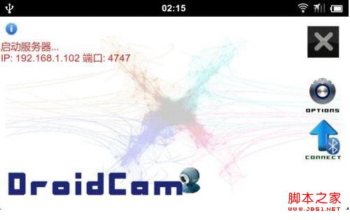 如果您手机与电脑都支持无线网络,并且有无线网络的时候,那么可以使用Wifi无线,将电脑与手机摄像头连接使用。方法是先打开手机WiFi并连接上无线路由,然后在手机上启动DroidCamX,看到如下画面。显示IP:192.168.1.102 端口:4747,如下图: