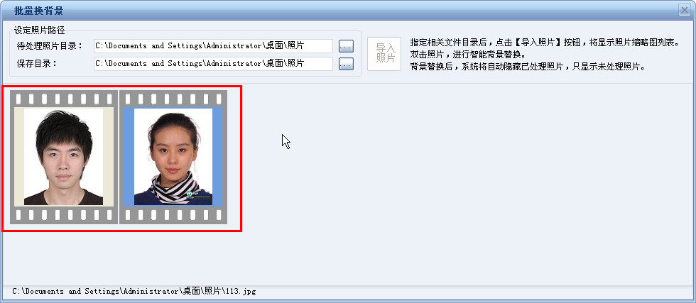 设定待处理照片目录和保存目录,点击“导入照片”,窗口上出现相关证件照列表。双击照片缩略图,界面上即跳出“智能背景替换窗口”,根据提示进行魔术擦设置。