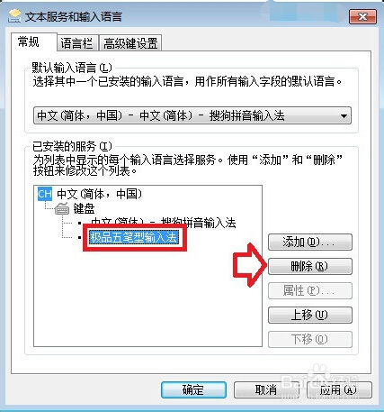 3、文本服务和输入语言→常规→点选 极品五笔新输入法→删除→确定