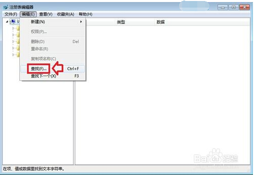 5、打开之后,勿忘点击一下计算机(因为注册表有一个记忆功能,会停留在之前打开过的地方)→编辑→查找
