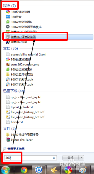 比如360极速浏览器,我们就能在开始--搜索框中输入360--程序中就会有360极速浏览器的卸载程序,我们直接运行就可以了。很便捷,也很快,但是对于搜狗浏览器并不适用,因为,这个程序被其放在其它文件夹里了。