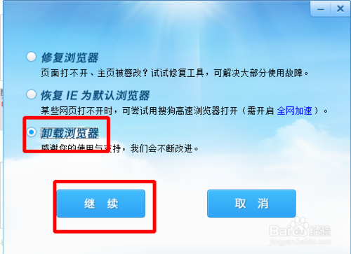 这个时候搜狗自身的卸载器就弹出来了,我们选择卸载浏览器,然后继续。