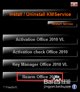 然后按任意键关闭dos命令输入框,返回到kms激活工具,并点击【Rearm office 2010】,中文意思是重置office 2010软件,该KMS激活工具适合2010版本的office 软件。