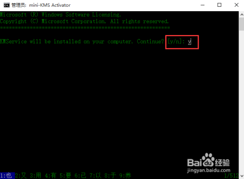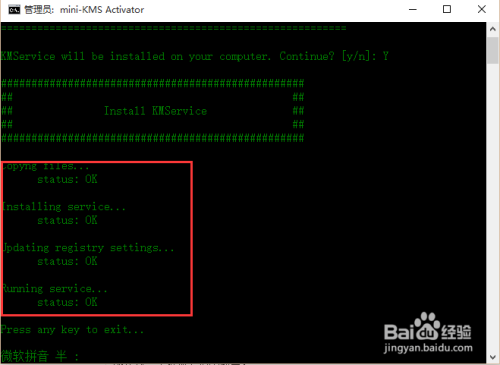 点击之后弹出dos命令输入框,输入Y,代表yes的意思,输入y之后弹出四个OK选项,如下图所示,证明kms服务器正确安装。