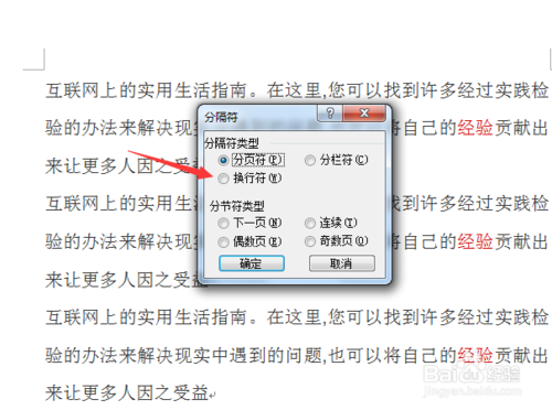 然后就会弹出一个分隔符的选项框中,在分隔符类型有很多,进行选中“换行符”即可,点击“确定”。