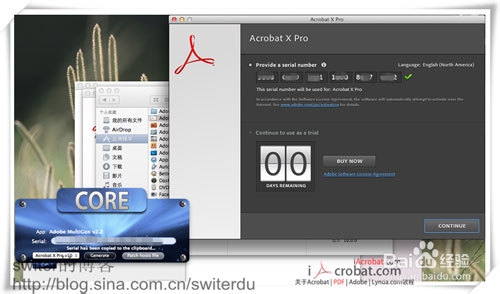 6. 之后弹出序列号的窗口,这是需要打开注册机,选择acrobat x pro v10,点击"Generate"生产序列号,双击序列号复制,然后粘贴到对话框内。点击继续即可!!注意:此时千万不要关闭注册机!!下面还会用到!