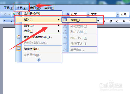 02、依次点击菜单选项“表格”-->“插入”-->“表格”选项,打开“插入表格”对话框。如图所示;