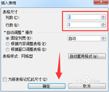 03、在“插入表格”对话框中输入要插入的“行与列数”,然后再点击“确定”按钮。如图所示;