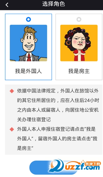 外国人本人申报住宿登记请点击“我是外国人”,留宿外国人的房主请点击“我是房主”