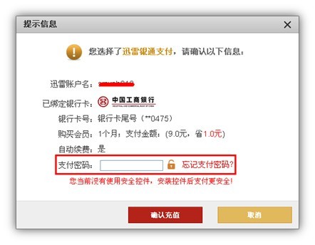 2、为了保证您的账户安全,建议您支付前先安装安全控件:http://pay.xunlei.com/activex/ff/XLSafeEdit.exe;