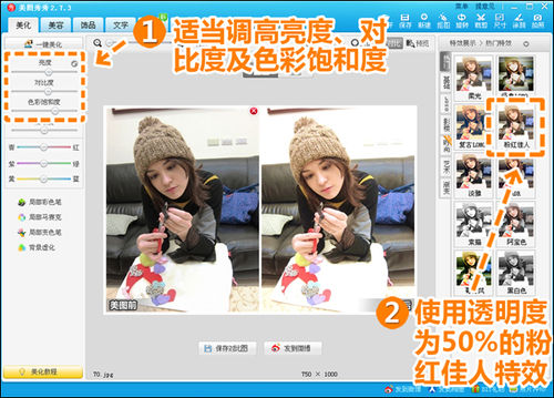 1、在“美图秀秀”中打开照片。适当调高亮度、对比度以及色彩饱和度,并使用透明度为50%的“粉红佳人”特效,让照片色调鲜亮起来。