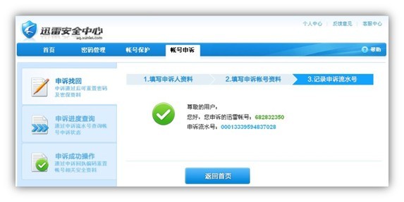 (4)帐号申诉提交记录完毕,保存好申诉流水号,以便您随时查看目前申诉进度;(3个工作日内系统自动给予帐号申诉进行处理,请耐心等待)