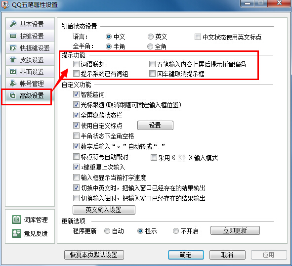 2、单击:属性设置,进入属性设置界面,选择“高级设置”,然后去掉“词语联想”的勾选即可。如图: