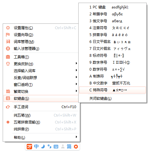 特殊符号指相对于传统或常用的符号外,使用频率较少字符且难以直接输入的符号,比如:数学符号;单位符号;制表符等。万能五笔2016特殊符号输入方法有五种:调出符号软键盘(新增功能)、 鼠标点击 、 自定义方式输入 、 编码输入、 快捷键Ctrl+数字