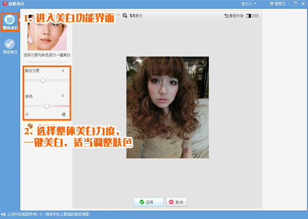 1、在“美图秀秀”软件下,打开待处理的一张照片,进入“美容”菜单下,选择“皮肤美白”功能,在整体美白界面中选择合适的力度。