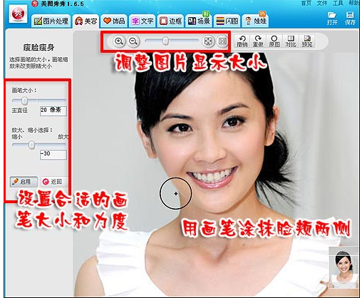 2.设置好画笔的大小和力度后,在脸的左边抹几下,右边抹几下脸就变尖了哦。