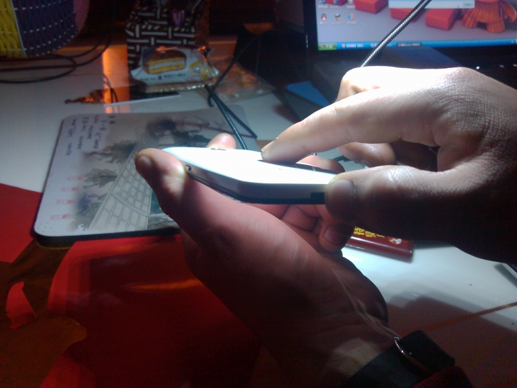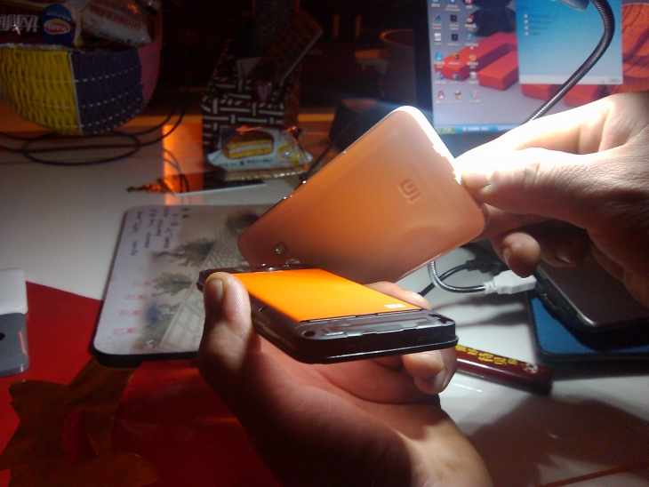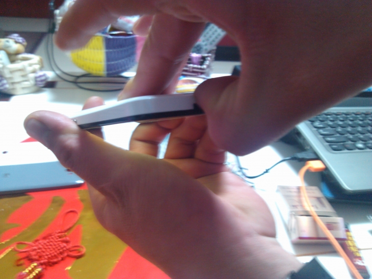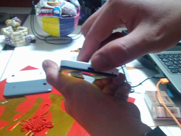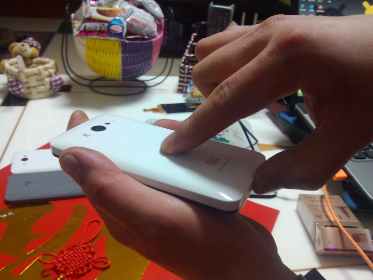 我们先看看图文详解一下,首先您把您的中指也好食指也好支撑在米二后盖中间下面那个点,如图: