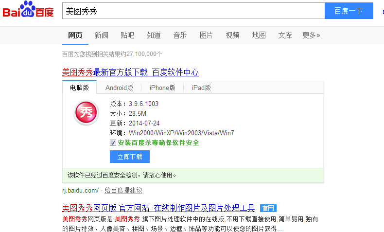 1、在浏览器搜索美图秀秀,或是在网页上直接打开美图秀秀官方网址http://xiuxiu.web.meitu.com/