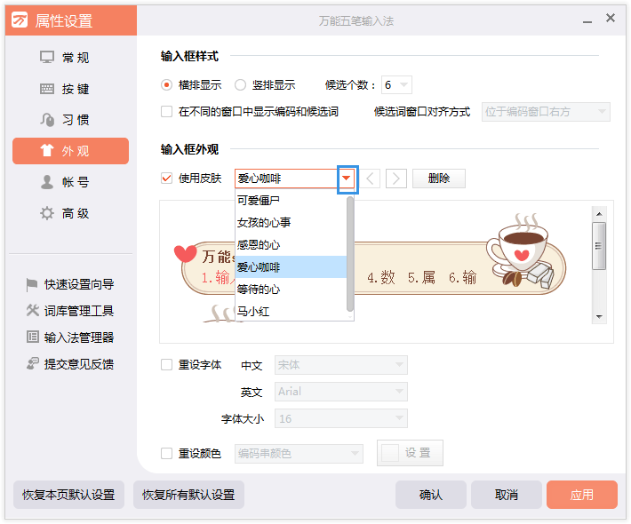 在设置属性-外观-可以去设置喜欢的皮肤,字体及颜色设置。