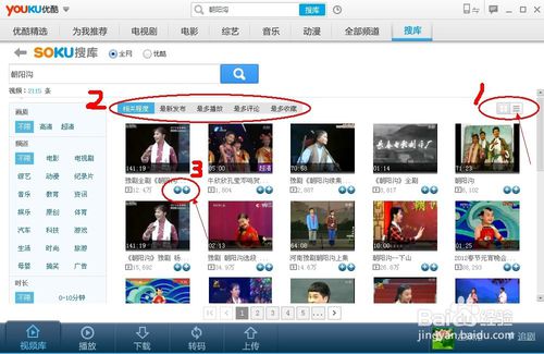 第三步:打开优酷客户端,搜索想要下载的戏曲名称,选择合适的资源.通过标记①更改显示样式;标记②筛选;标记③为下载按钮,点击即可下载