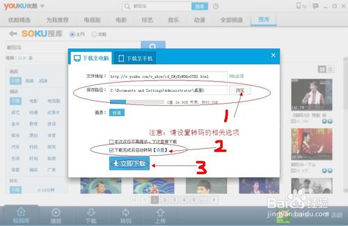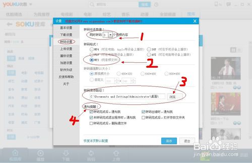 第四步:设置下载选项。标记①为修改下载文件保存路径;请将标记②选中点击设置按钮,查看第五步设置;设置完成后点击标记③下载按钮开始下载戏曲视频并转化为MP3格式。请先根据第五步设置再点击下载
