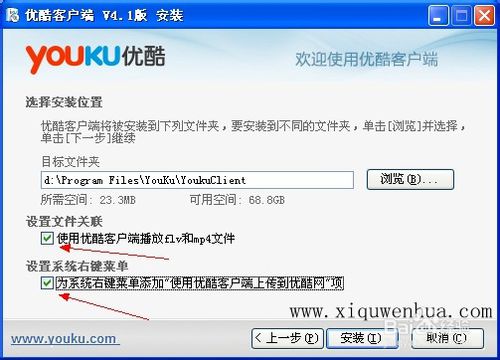 第二步:安装优酷客户端,安装的时候请注意修改安装路径,去掉一些不必要的选项。如下图标记处