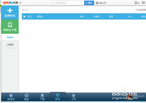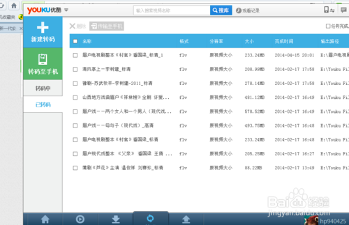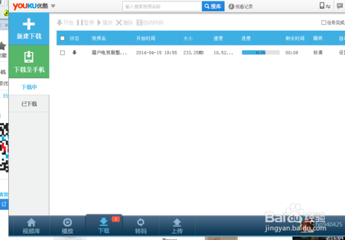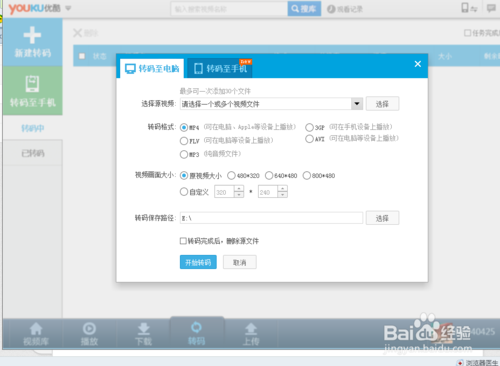 点击下方“转码”,点击“新建转码”,选择“源文件”,选择刚下载的文件,选择转码格式“FLV”,点击“开始转码”,完成后在你转码文件放置的文件夹中找到此文件,即可传至U盘