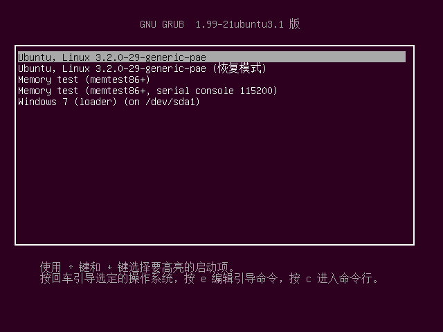 重启,就能看到Ubuntu启动菜单了: