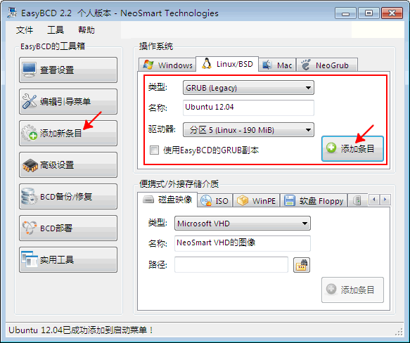 进入Windows7操作系统,下载安装EasyBCD,运行软件,按下图步骤添加启动条目: