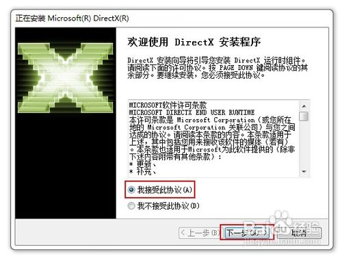在出现的欢迎界面中选择“我接受协议”并点击“下一步”。