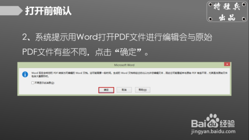 2、系统提示用Word打开PDF文件进行编辑会与原始PDF文件有些不同,点击“确定”。