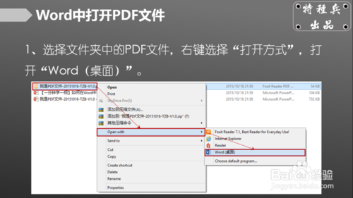 1、选择文件夹中的PDF文件,右键选择“打开方式”,打开“Word(桌面)”。