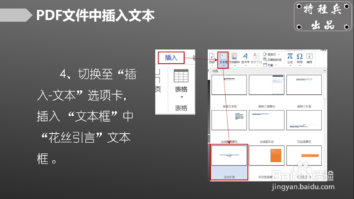 4、切换至“插入-文本”选项卡,插入 “文本框”中“花丝引言”文本框 。