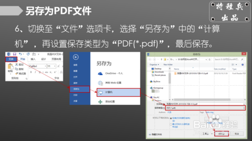 6、切换至“文件”选项卡,选择“另存为”中的“计算机” ,再设置保存类型为“PDF(*.pdf)”,最后保存。
