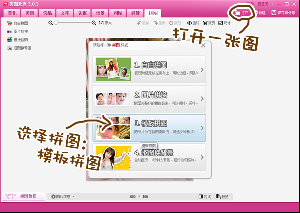 1、在“美图秀秀”软件下打开一张图片,点击“拼图”选择“模板拼图”样式。