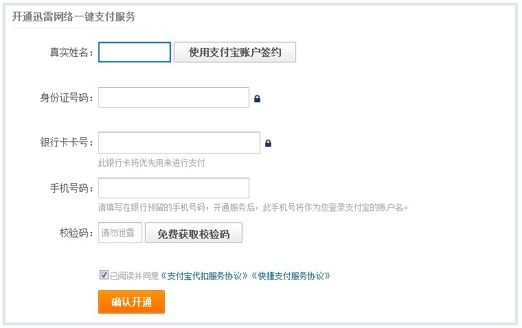 是指用户授权将迅雷帐号与支付宝账户进行关联,或直接关联银行卡,在迅雷平台进行消费时,借助支付宝账户余额、银行卡、快捷支付的资金渠道通过短信验证码或直接扣款的方式,轻松便捷地完成交易的一种支付方式。
