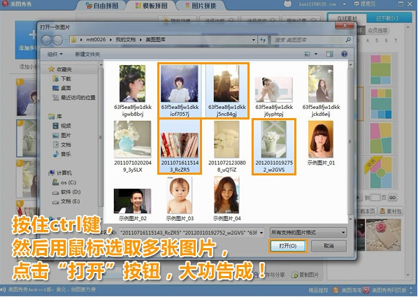 2、按住ctrl键,用鼠标选取你想要的图片,再点击打开按钮,这样就大功告成了。