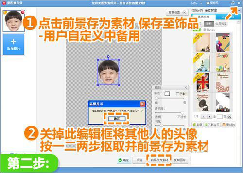 二、跳转到新界面下,点击“前景作为素材”,将抠取的头像存到“饰品—用户自定义”中,然后叉掉此编辑框,按照一二两个步骤,将照片上其他人的头像也抠好并存为素材。