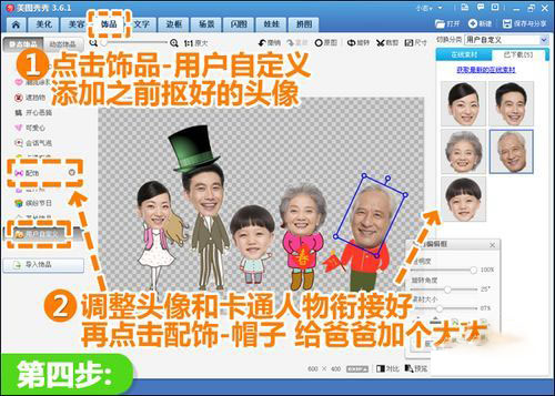 四、仍在“饰品”菜单下,点击“用户自定义”分类,将之前抠取好的头像添加进来,调节每个头像的大小位置及角度和卡通人物衔接好。不合适的地方可以做些修正,比如点击“配饰—帽子”给爸爸加一定高帽解决卡通帽被头像遮盖的情况。