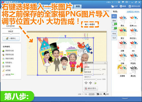 八、背景图制作好后,鼠标右键选择“插入一张图片”,将之前保存的全家福.PNG格式的图片导入进来,调节大小位置和背景衔接好,就大功告成了!
