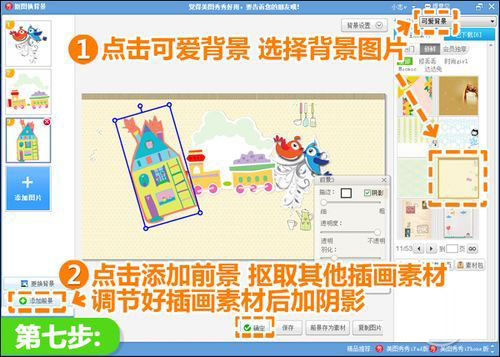 七、再点击“添加前景”,将其他插画素材抠出,然后选择一个可爱背景图片,调节各个插画素材的大小位置及角度,再加上阴影点击“确定”。