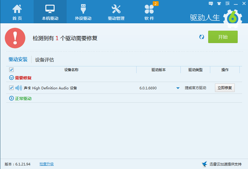 先打开驱动人生的客户端,点击本机驱动给所有的驱动做一个检测。小编为了让大家有更直观的感受,手动卸载了声卡。经过检测,驱动人生发现声卡驱动有问题,由于驱动人生是主打一键安装修复的,所以我们只需点击开始就行。