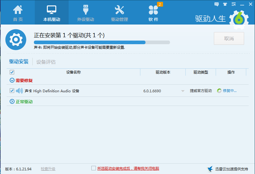 点击开始后,声卡就会自动修复安装。不需要再额外勾选了,即使是电脑小白也只需跟着提示一步一步点击就可以了。