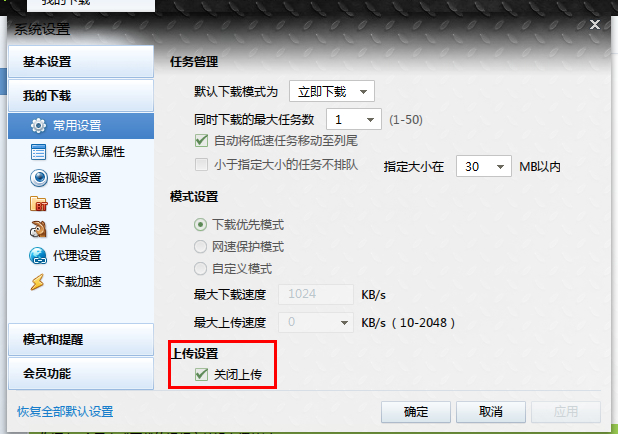 2、通过系统设置 =》选择我的下载 =》进入常用设置 =》上传设置中的关闭上传勾选上;
