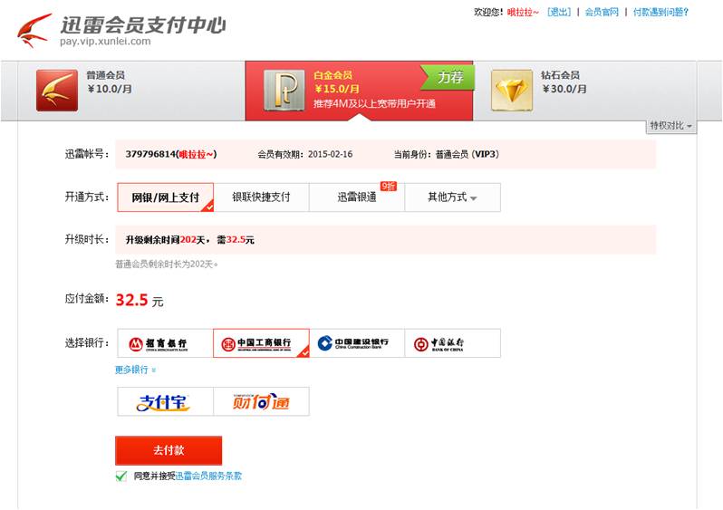 如果您是迅雷普通会员,登录到迅雷增值服务支付中心则会自动提示需要多少金额升级到白金会员的,如下图显示。